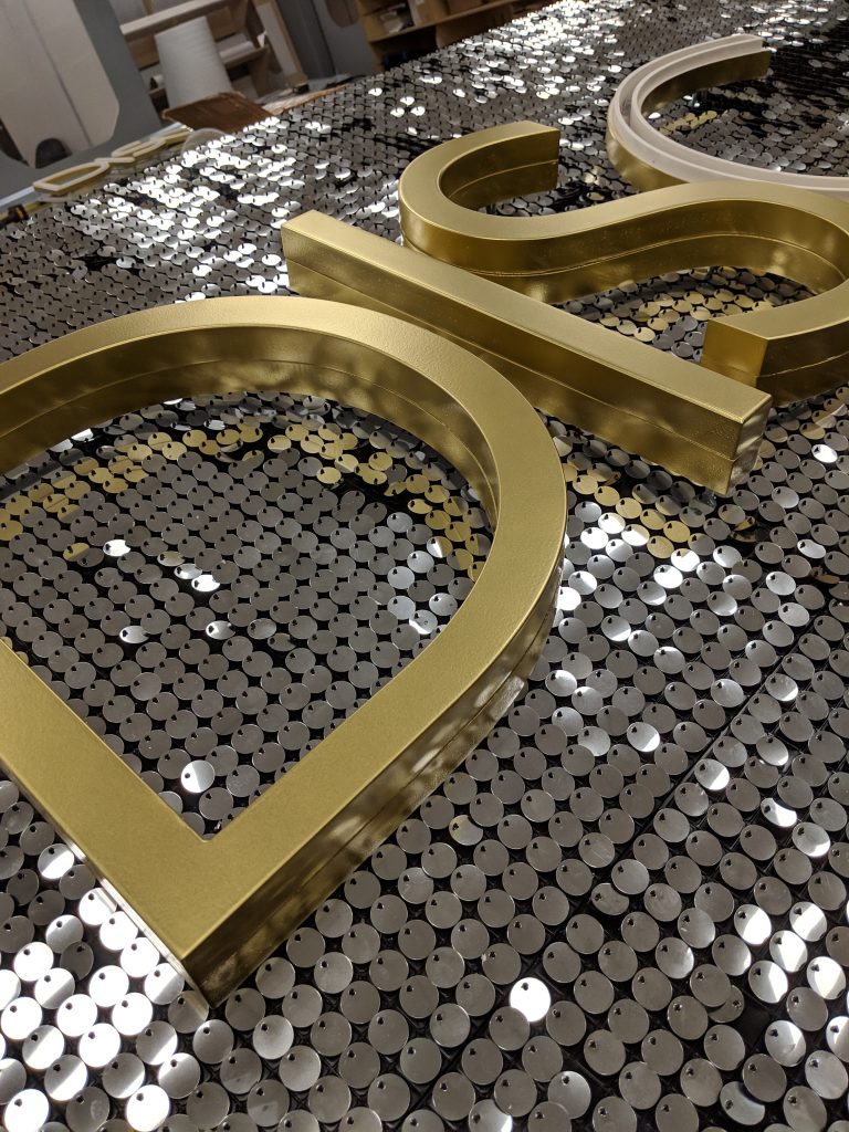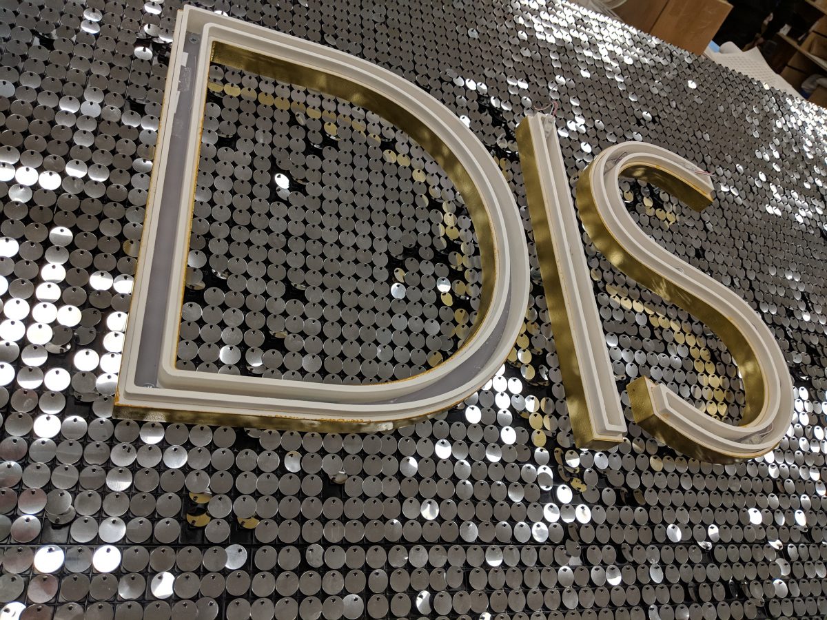 - Every sequin on this sign was individually placed by hand. The 3D letters contain the LED lighting within.